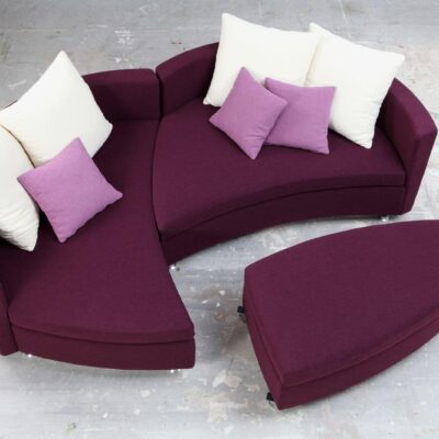 Die Sitzpolster der Elemente und des Hockers sind mit Klettband am Korpus befestigt. Die Bezüge der Sitz- und Rückenkissen sind abnehmbar und dadurch leicht zu reinigen. Optional auch mit komplett abnehmbaren Bezügen und Naturpolsterung erhältlich.