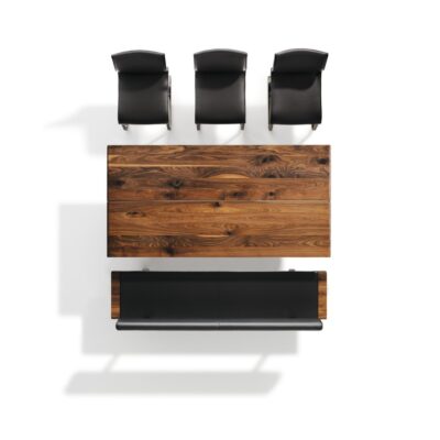 Tischlein, streck dich: Unser nox Tisch lässt sich mit seinem leichtgängigen Synchronauszug und der sanften, materialschonenden 2soft Ausschwenktechnik problemlos um 60 oder 120 cm verlängern. Eines der charakteristischen Merkmale unseres nox Tisches – und für Kenner gleichzeitig ein Symbol höchster Handwerkskunst: die gegenläufig gerundeten Kanten der soliden Tischplatte.